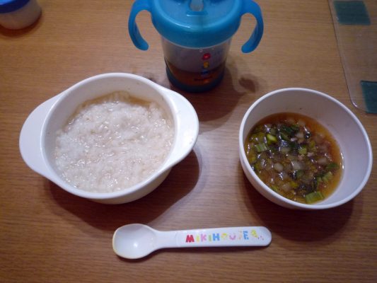 昨日の離乳食で出したアスパラスティックをもう二本フリージングしていたので、お昼にまたアスパラスティックを出したのだが、やっぱり苦手らしく、ほとんど食べてくれなかったので、今日の離乳食に具として使ってみた。